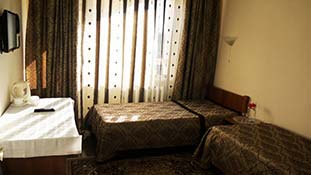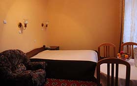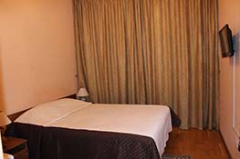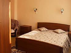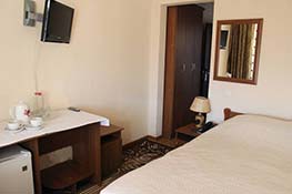Кровать двуспальная, 2 тумбочки, стул, туалетный столик с зеркалом, Фен, шкаф для одежды, светильник.