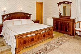 Двуспальная кровать, Две тумбочки, Два светильника, Туалетный столик с зеркалом, Стул, Телефон, Чайник.