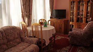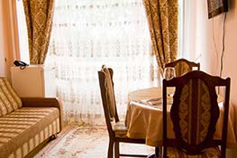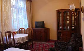 Диван раскладной, обеденный стол, 4 стула, 2 кресла, журнальный столик, комод, горка с набором посуды, ЖК-телевизор, телефон, чайник.